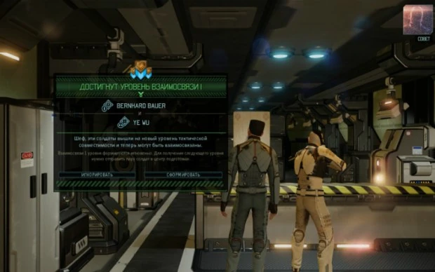 | “ | У каждой пары солдат есть свой уровень совместимости. Чем больше совместимость, тем выше вероятность образования связи, когда они оба участвуют в выполнении задания. Возможны также особые события, которые влияют на совместимость: например, когда солдат спасает потерявшего сознание товарища, или если больше половины отряда уничтожено. В критические моменты вероятность образования связи гораздо выше. Когда между солдатами возникнет взаимосвязь, вы начнете видеть их на «Мстителе» вместе — как в баре, так и на стрельбище. Установив одну взаимосвязь, солдат уже не сможет сменить ее, пока его товарищ жив. Если один погибнет, то второй может потерять самообладание; однако со временем он оправится от потери и будет готов установить новую связь. |