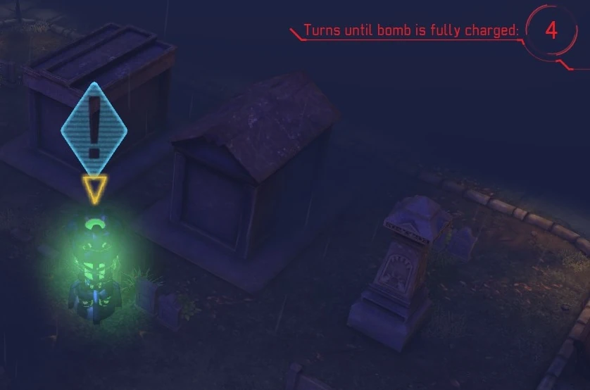 The goal of the mission is to disable the alien timed bomb, and eliminate all hostiles in the area. The mission has a timer, measured in turns, until the bomb goes off, and can be failed if the bomb is not deactivated before the timer reaches zero. You have 3 turns to start with. If the timer reaches 0 you are given 3 turns to evacuate before the bomb goes off. Multiple alien generator devices are scattered throughout the map, and disabling them prolongs the timer. A soldier must be in a tile immediately adjacent to the device to deactivate it; the devices cannot be disabled diagonally. Fortunately, the devices offer semi-cover, which may or not make them convenient for tactical advance. In XCOM: Enemy Unknown, disabling a device doesn't cost an action so you can sprint to the bomb and still disable it unless that is the last action of the team, in which case the turn is automatically ended (this has been modified in XCOM: Enemy Within). Assault Class units may also activate Run & Gun to dash to a node and then deactivate it.