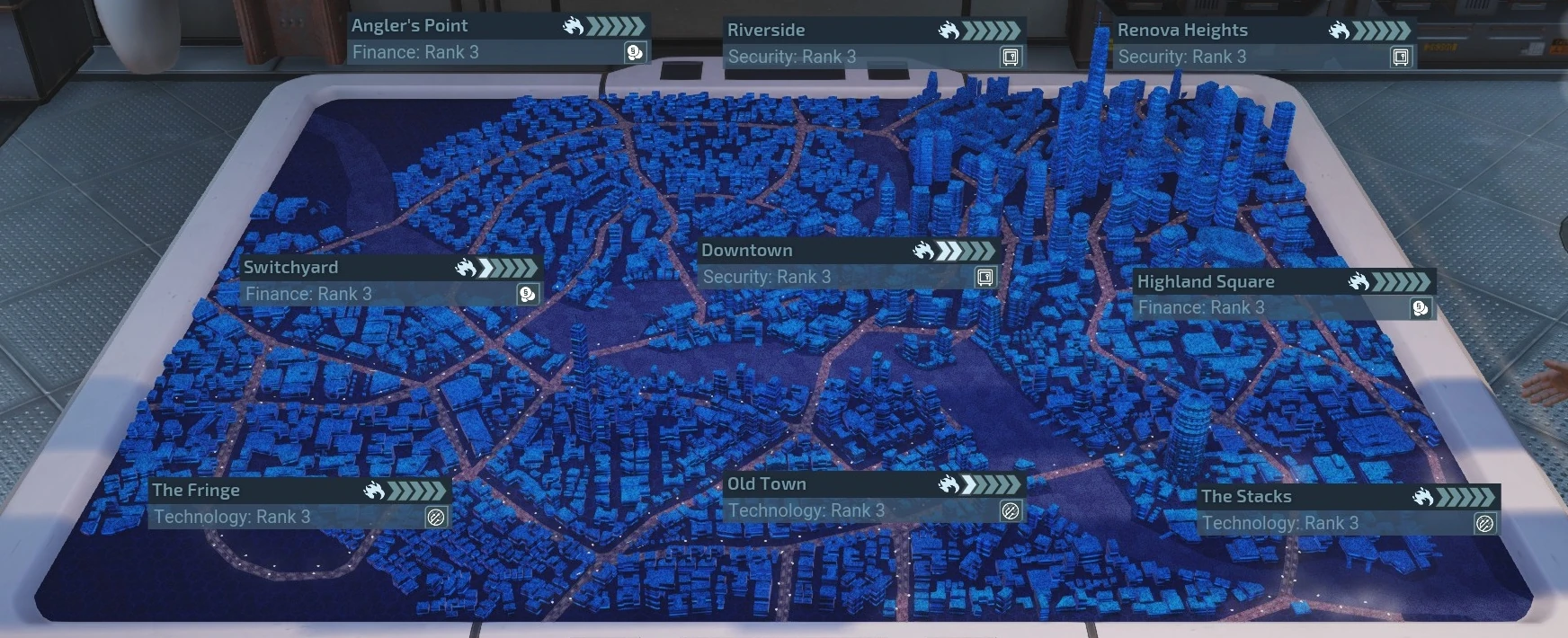 City 31 is broken up into nine different districts including The Stacks, Downtown, Old Town, Angler's Point, Switchyard, The Fringe, Riverside, Renova Heights, and Highland Square.