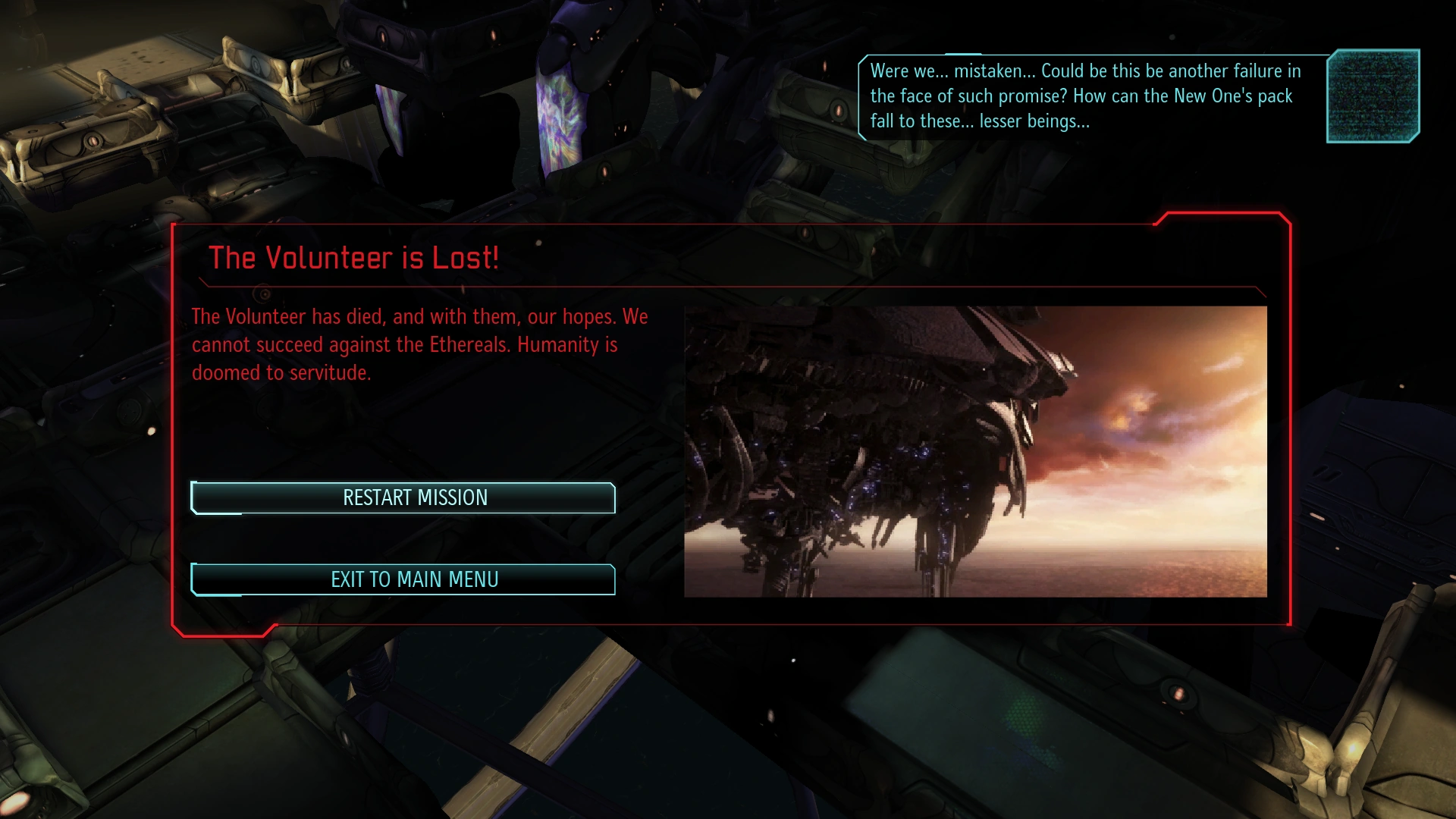 - If the Volunteer is being Mind Controlled by a regular Ethereal when the Uber Ethereal is killed, the game will act as if the Volunteer was killed and will result in mission failure. This can be avoided by killing the Ethereal who is Mind Controlling the Volunteer before killing the Uber Ethereal. Note, if it is the Uber Ethereal who is Mind Controlling the Volunteer, killing the Uber Ethereal will end the game as normal.